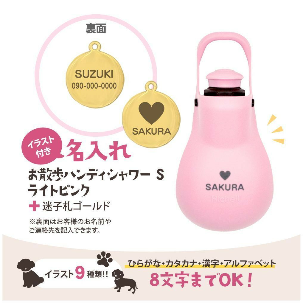 他の画像を見る 散歩時のエチケットの水分補給にも便利なハンディシャワーと万が一の時のための迷子札のセットです。 【名入れ】お散歩ハンディシャワー S ライトピンク 名入れ + 迷子札20mm金名前入り メタル 金属 メダル 名前札 ネームプレート ペット 犬 散歩 ギフト プレゼント リッチェル ¥ 2,565 税込 在庫切れ 大好きなワンちゃんのお散歩グッズに名入れ出来ちゃうオリジナルギフトだよ カートに入れる お気に入りに登録する