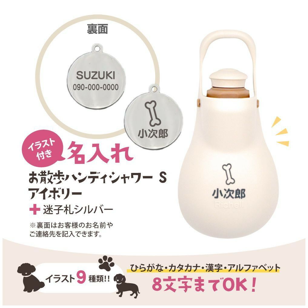 他の画像を見る 散歩時のエチケットの水分補給にも便利なハンディシャワーと万が一の時のための迷子札のセットです。 【名入れ】お散歩ハンディシャワー S アイボリー 名入れ + 迷子札20mm銀 名前入り メタル 金属 メダル 名前札 ネームプレート ペット 犬 散歩 ギフト プレゼント リッチェル ¥ 2,565 税込 大好きなワンちゃんのお散歩グッズに名入れ出来ちゃうオリジナルギフトだよ カートに入れる お気に入りに登録する