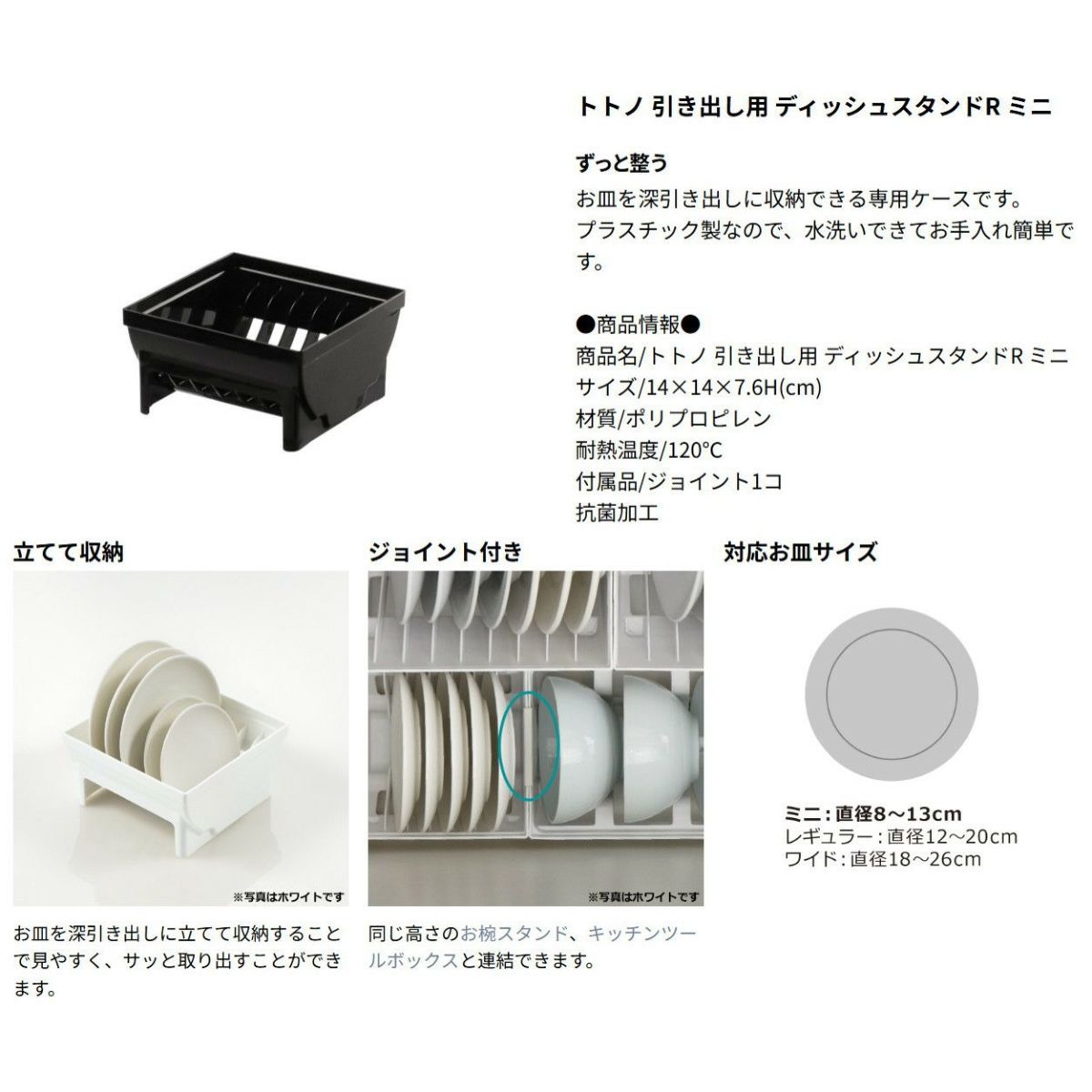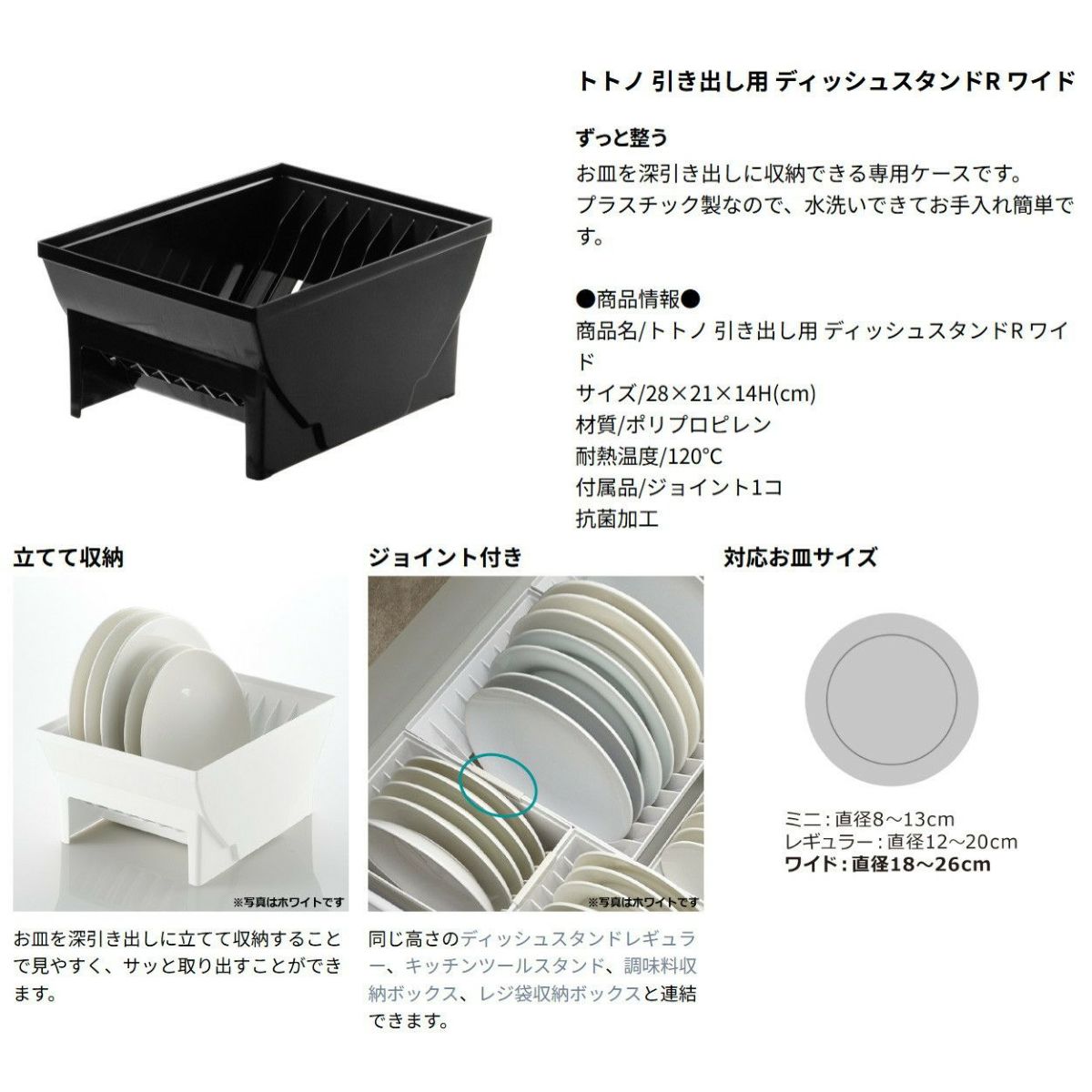 他の画像を見る ウェブショップ限定カラーのブラック。ディッシュスタンドR ミニ・レギュラー・ワイドのセットです。 【セットでお得】トトノ 引き出し用 ディッシュスタンドR 3種 5点ブラック セットリッチェル WEB限定カラー キッチン 引き出し シンク 下 収納 食器 皿 お椀 プラスチック 日本製 国産 定価 ¥ 5,170 のところ ¥ 4,913 税込 大人気のトトノの特別カラーやちゃ! カートに入れる お気に入りに登録する