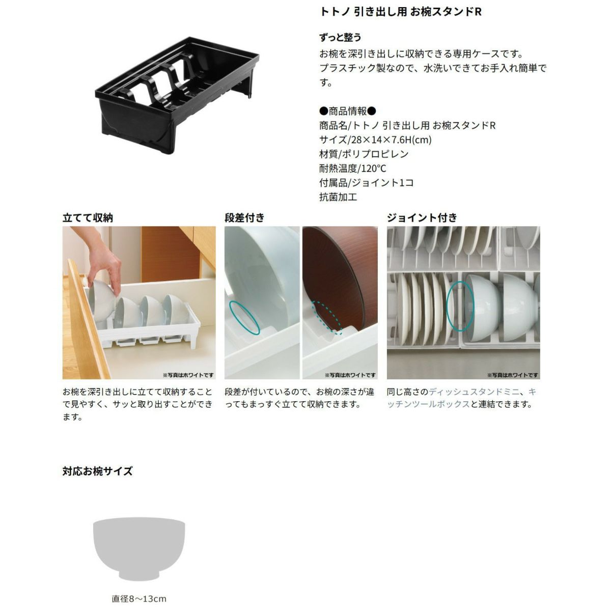他の画像を見る ウェブショップ限定カラーのブラック。お椀を深引き出しに収納できる専用ケースです。 トトノ 引き出し用 お椀スタンドR ブラックリッチェル お椀 茶碗 皿 仕切り 食器 収納 ケース 縦 置き WEB限定カラー キッチン 引き出し シンク下 プラスチック 日本製 国産 定価 ¥ 880 のところ ¥ 880 税込 大人気のトトノの特別カラーやちゃ! カートに入れる お気に入りに登録する