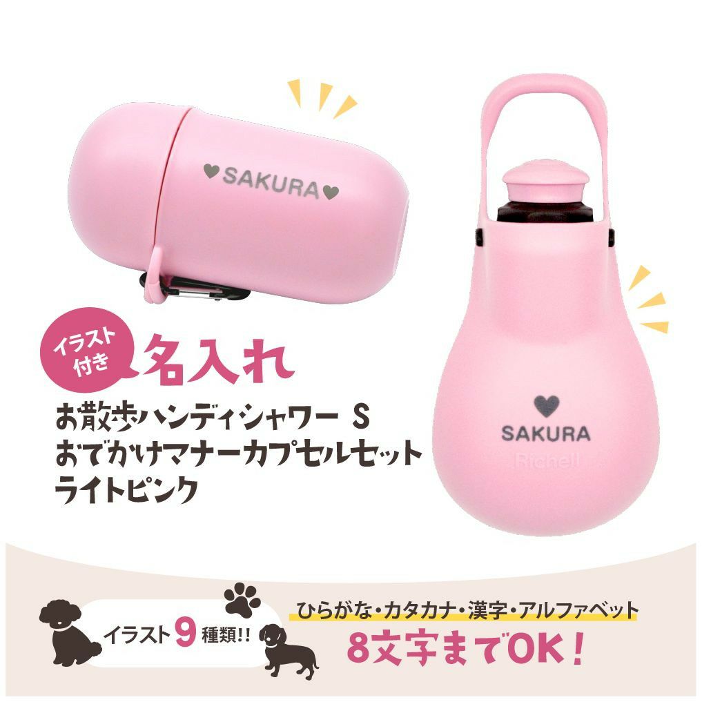 他の画像を見る 犬 カラビナ付き フック付き 名前入り 散歩 マナー エチケット 水分補給 フン袋入れ プレゼント オリジナルギフト リッチェル 【名入れ】【セットでお得】お散歩ハンディシャワー S ライトピンク(059958)&おでかけマナーカプセル ライトピンク(059961) ¥ 2,700 税込 大好きなワンちゃんのお散歩グッズに名入れ出来ちゃうオリジナルギフトだよ カートに入れる お気に入りに登録する