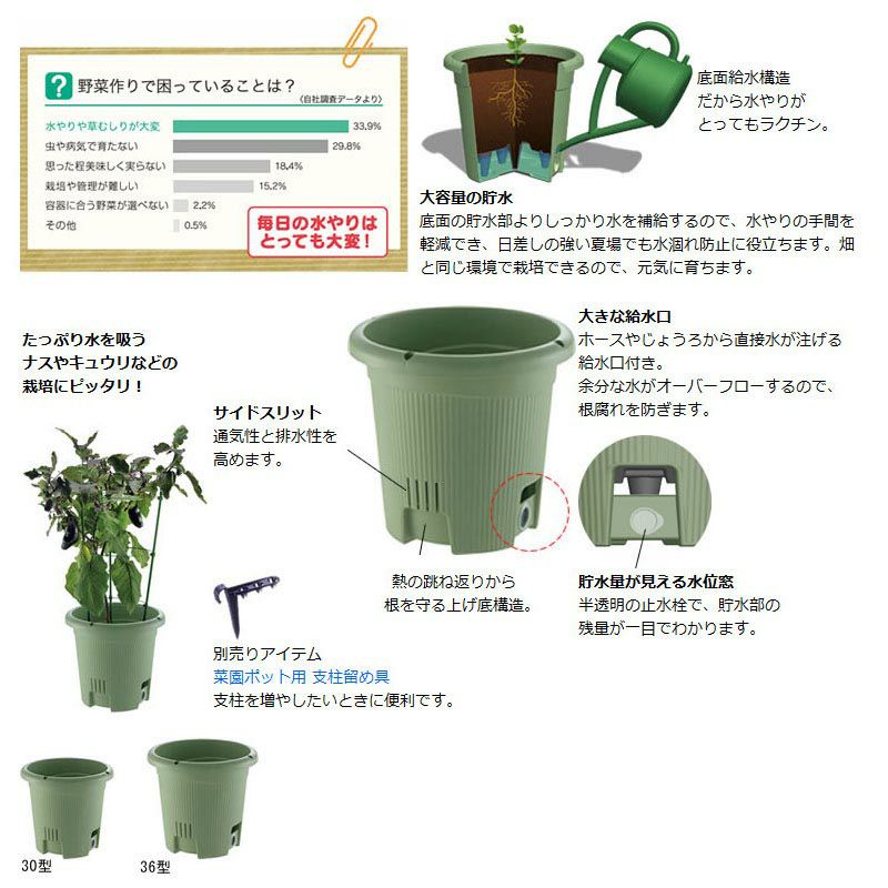 他の画像を見る 菜園上手シリーズの底面給水丸型プランター。実もの野菜の栽培にどうぞ。 リッチェル 水ラク 菜園上手 丸 36型 定価 ¥ 1,650 のところ ¥ 1,500 税込 貯水機能付きで植物に優しいよ!夏の暑い期間や旅行時にも安心やちゃ カートに入れる お気に入りに登録する
